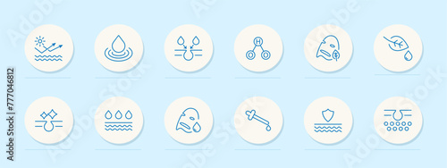 Skin care icon set. HO2, hydroperoxyl, leaf, drops, liquid, mask, natural products, skin protection, cream, oil, silhouette, blue colors. Health care concept. Vector line icon.
