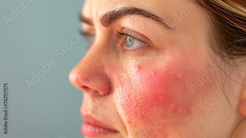 Skin condition close-up. A woman's face with visible signs of rosacea, characterized by redness on her cheeks, nose, and chin.