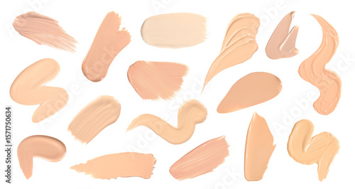 Skin foundation in different shades on white background, set. Palette of cosmetic product