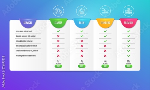 Skin moisture, Skin cream and Ambulance car icons simple set. Comparison table. Hospital building sign. Wet cream, Medical cosmetic, Emergency transport. Medical help. Healthcare set. Vector