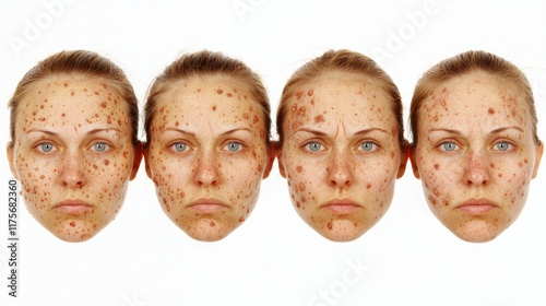 Skin Problems with Cystic Acne and Uneven Texture on Female Face in Four Expressions