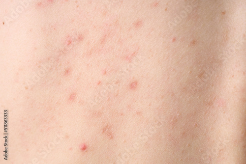 Skin with acne, with red spots. Health problem, skin diseases. Close up Allergy rash. Dermatitis problem of rash.