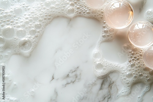 skincare advertisement, hydrating bubbles containing hyaluronic acid on a sleek marble backdrop, reflecting gentle natural light, perfect for text