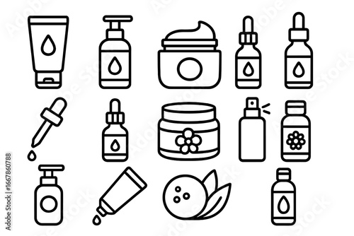 Skincare and Beauty Icons Set, Creams, Serums, Lotions, Droppers, Sprays, Natural Ingredients, Cosmetic Containers, Flat Line Vector Illustration Transparent Background