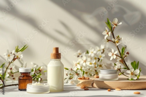Skincare and wellness products with almond blossoms in natural light, promoting beauty and natural ingredients.