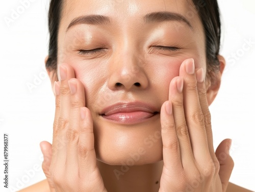 Skincare with beautiful Japanese Korean woman in her late thirties, with dark hair and wearing a white sleeveless top. Facial treatment, Cosmetology, Spa, Aesthetic, plastic surgery
