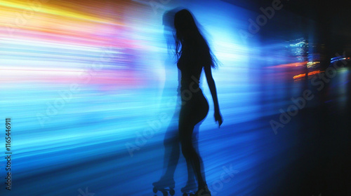 Skinny young Asian girl roller skating with motion blur in a vibrant urban setting