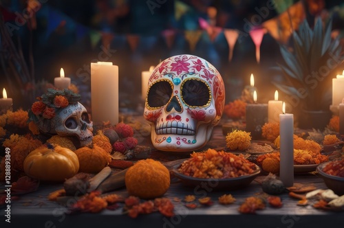 Skull flowers and candles on the day of the dead. Colorful illustrations