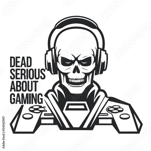 Skull Gamer Illustration: Black and white vector graphic of a skull wearing headphones and integrated into a gamepad design, conveying passion for video gaming.