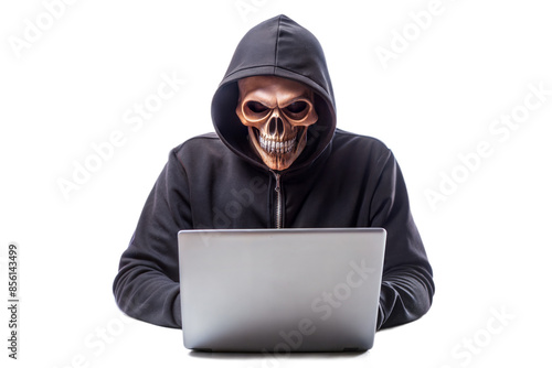 skull hacker with laptop computer on transparent background