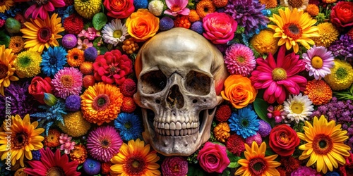 Skull surrounded by vibrant and colorful flowers, representing a beautiful contrast between life and death, skull, flowers