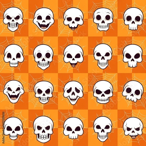 Skulls and spider webs on orange plaid background, seamless Halloween pattern for fabric, cheerful wrapping, square template