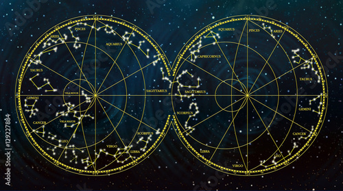sky map depicting constellations and zodiac signs.