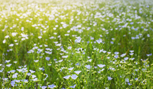 Sky-blue flax flowers grow in a huge field. Raw materials for the textile and oil industry.