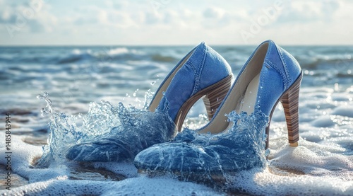 Sky-blue high heels partially submerged in ocean waves on a sandy shore