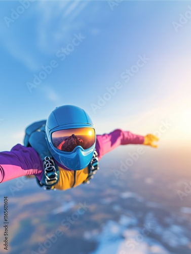 Skydiver in Freefall with Reflective Goggles Capturing Stunning Aerial View
