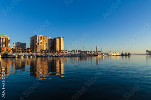 Skyline at the port of malaga with calm water
