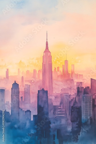 skyline of big city with skyscrapers like new york, watercolor painting, soft pastel colors, panorama of megapolis, sunset travel wallpaper, urban landscape banner, midtown background