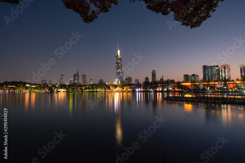 Skyline of Nanjing city by Xuanwu lake in the night in China