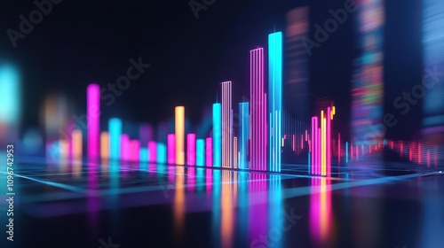 Skyscraper cityscape, holographic market graphs, 3D illustration
