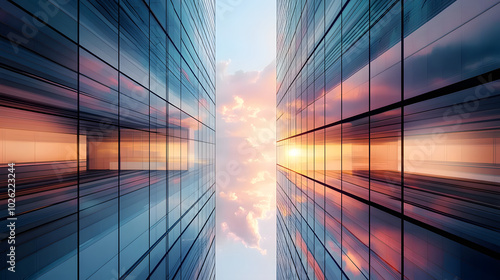 Skyscraper reflecting sunset background. 3d abstract architecture design of modern contemporary luxury building converging glass and steel. Perspective view landscape. Hi-tech sustainable architect.