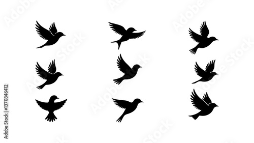 Skyward Silhouette: A mesmerizing formation of birds gracefully ascending, painted in stark black against a simple backdrop, evokes a sense of freedom, serenity, and endless possibilities.