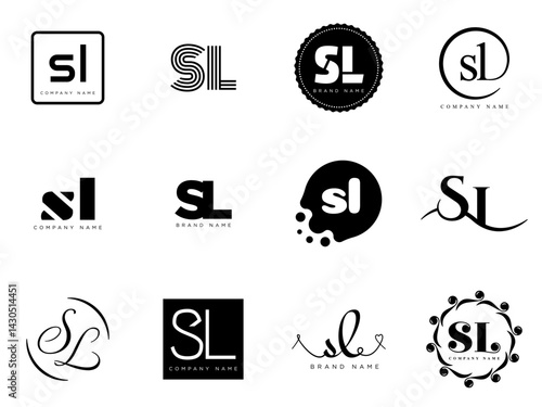 SL logo company template. Letter s and l logotype. Set different classic serif lettering and modern bold text with design elements. Initial font typography.