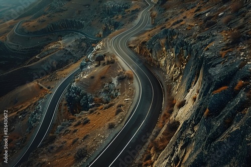 Sleek Aerial View of a Winding Mountain Road Through a Rugged Landscape