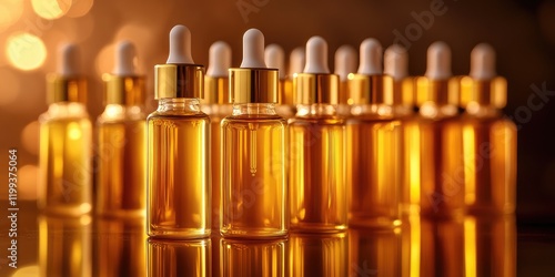 Sleek amber glass droppers lined up against a warm golden background ideal for beauty magazines and spa promotions with ample copy space for text.