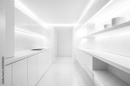 Sleek and modern all-white kitchen with a minimalist aesthetic, floating shelves, under-cabinet lighting, and elegant tile flooring