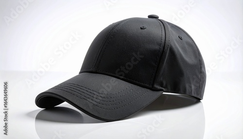 Sleek black baseball cap isolated on a white reflective surface. A versatile and modern fashion accessory.