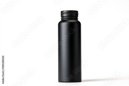 Sleek black bottle with a matte finish, standing against a bright white background. Perfect for minimalist branding.