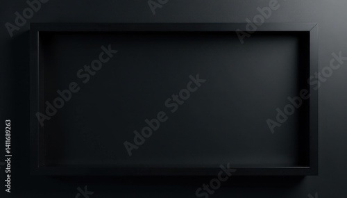 Sleek black frame against a stark black backdrop , black border, photo frame, elegant