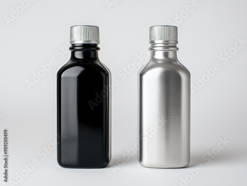 Sleek Black Glass and Brushed Silver Metal Bottles on White, Minimalist Industrial Product Mockup