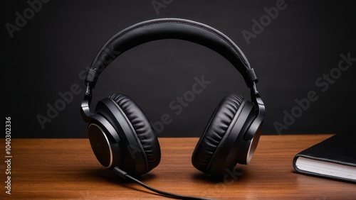 Sleek black headphones rest on a wooden desk beside a notebook, set against a dark background, capturing a modern and minimalist aesthetic.