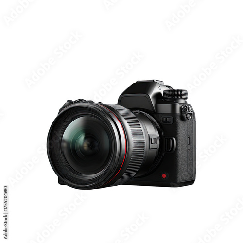 Sleek, black mirrorless camera with a large, professional lens; red accent detail visible