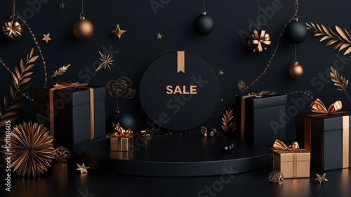 Sleek Black Podium Surrounded by Shimmering Holiday Sale Decor