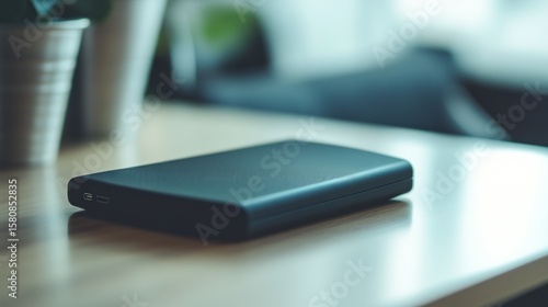 Sleek Black Portable Hard Drive on Wooden Desk, Soft Focus Background