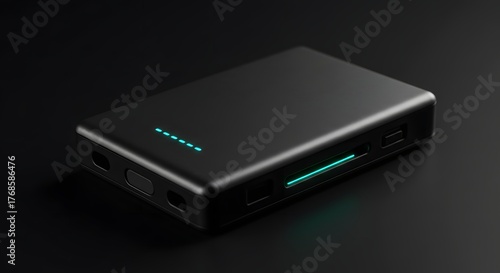 Sleek Black Portable Hard Drive or Power Bank with Glowing Indicators on a Dark Background, High-Tech Gadget, Modern Design, Technology, Close-Up, Minimalist, Product Photography, Digital Storage