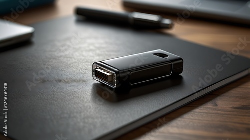 Sleek black USB drive on textured surface, a modern workspace accessory