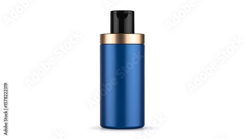 Sleek blue cosmetic bottle with golden accent isolated on white background.