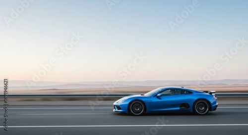 Sleek Blue Sports Car Speeding Down Highway with Scenic Backdrop