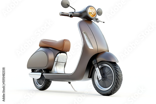 Sleek brown motor scooter with a classic design, perfect for urban commuting or stylish transportation featuring tires, seat, and reflective mirror.