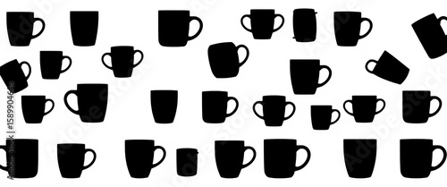 Sleek coffee mug silhouettes, various shapes & sizes, isolated on white, clipart, cafe