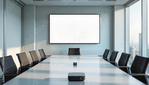 Sleek conference table setup with a large 3D TV screen in a modern office, ideal for client presentations
