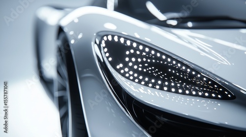 Sleek design features of a high-performance sports car highlighted in modern exhibition space