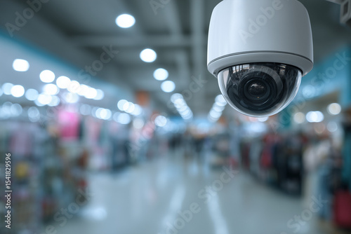 Sleek dome-shaped CCTV camera installed inside a retail store, with blurred background showing shopping aisles. Bottom copy space. Bright, clean commercial setting.