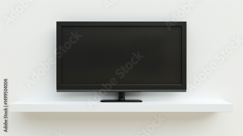 Sleek Flat-Screen TV on Minimalist White Shelf , Modern Design Focus, Clean Technology Aesthetic
