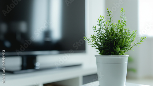 Sleek Flat-Screen TV on Minimalist White Shelf , Modern Design Focus, Clean Technology Aesthetic