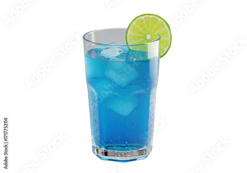 Sleek highball glass with condensation, vibrant clear blue beverage, and fresh lime wheel on rim, isolated on a transparent background with precise studio lighting, concept for beverage advertising